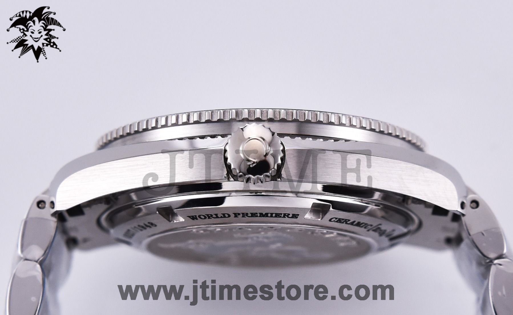 Dial     Black Ceramic Dial with Steel Numerals & Stick Markers (Swiss Grade Superlume applied)